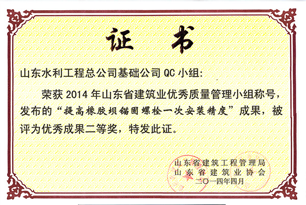 公司“提高橡胶坝锚固螺栓一次安装精度”荣获2014年山东省建筑业优秀质量管理优秀成果二等奖
