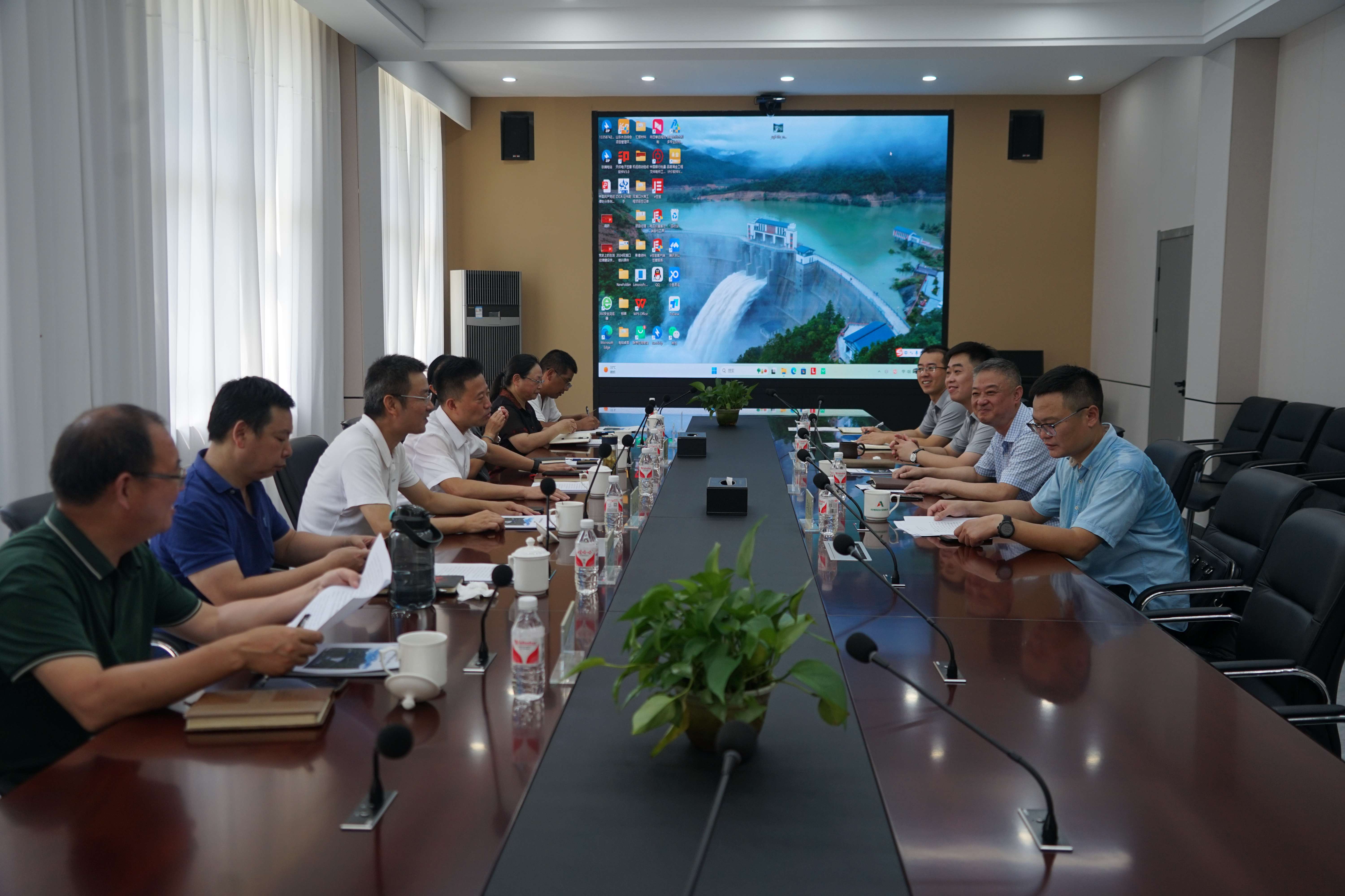 何建中一行来到现场认真观摩了双溪口水库的整体情况,了解水库重力拱坝及各项枢纽建筑物指标。在随后召开的座谈会上,鲁润公司介绍了双溪口水库工程概况、建设历程、运行管理等方面情况。临安区水利局局长汤文卓就水库的可研立项、招投标、行业管理、移民征迁等方面同考察组进行了深入的交流探讨。何建中指出,双溪口水库的成功经验对于徽州区水库项目建设具有重要的学习借鉴价值,希望双方加强协同合作,推动临安区、徽州区水利事业高质量发展。